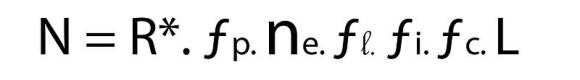 The Drake equation. N = the number of civilizations in the Milky Way galaxy with which communication might be possible; R? = rate of star formation in our Galaxy; fp = the number of stars that have planets; ne = the number of planets that could support life per star; fl = the number of planets that actually develop life; fi = the number of planets with intelligent life; fc = the fraction of civilizations that release detectable technosignatures; L = the length of time that those civilizations release detectable signals.