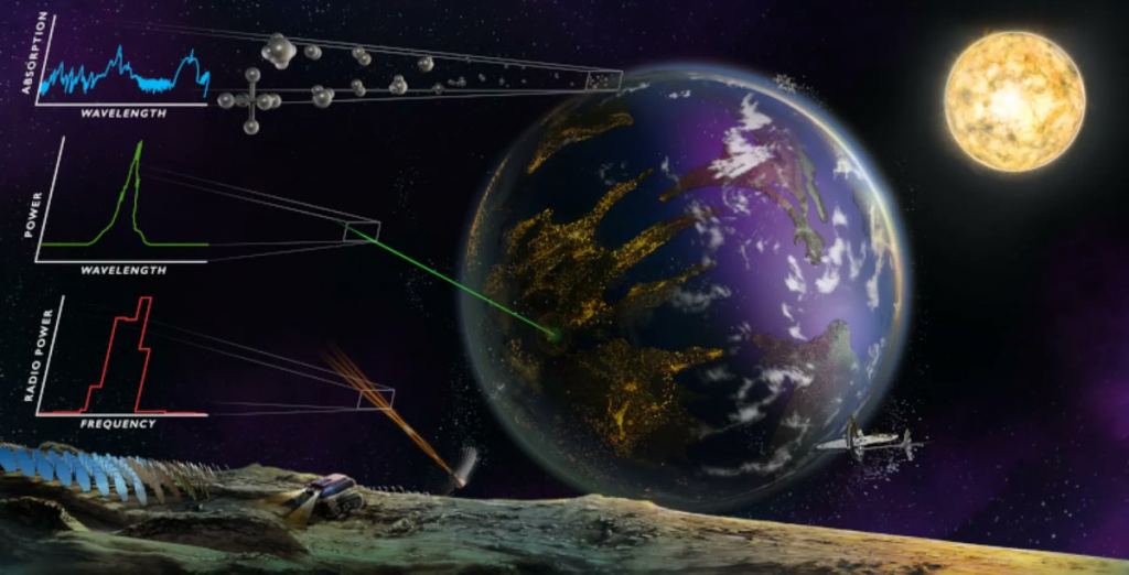 Concept image showing different types of possible technosignature signals. Credit – Haqq-Misra et al.