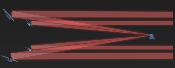 This artist’s illustration shows LIFE’s four telescopes and its central unit acting as an interferometer. Interferometers create a large and powerful “virtual telescope.” Image Credit: LIFE/ETH Zurich