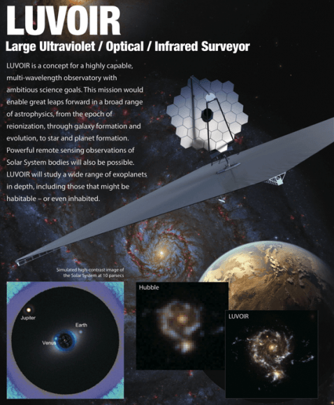 Poster Describing LUVOIR, one of the new generation observatories that could potentially detect Technosignatures. Credit – NASA / GSFC