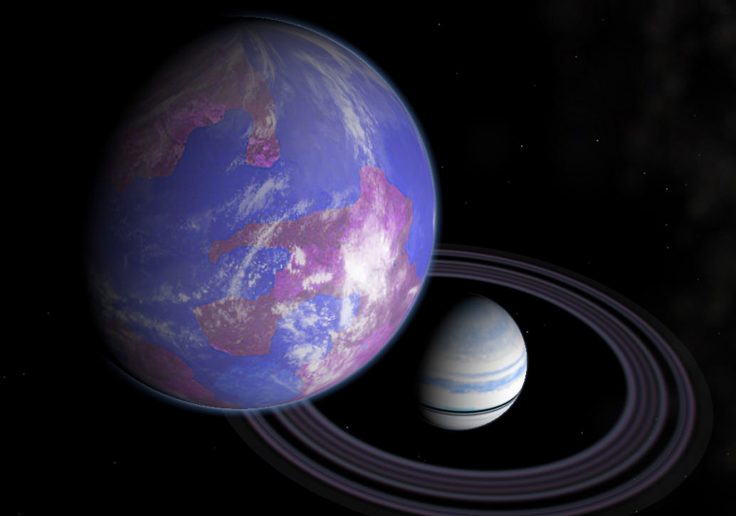 An artist impression of an exomoon orbiting a ringed exoplanet. Credit: Andy McLatchie