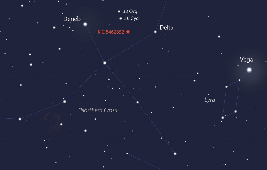 Tabby’s Star shines at magnitude +11.7 in the constellation Cygnus the Swan (Northern Cross) high in the southwestern sky at nightfall
