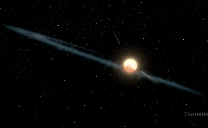 This illustration shows a star behind a shattered comet. Observations of the star KIC 8462852