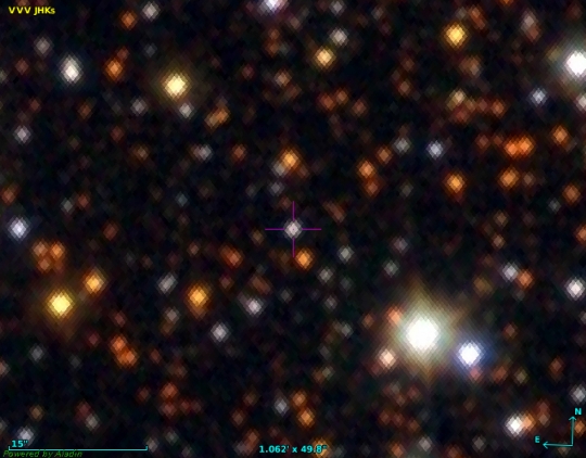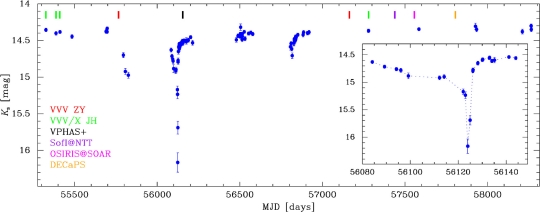 Image: VVV-WIT-07 in the centre of a star field. Credit: Saito et al. This is fertile ground for discovery, but even so, the object known as VVV-WIT-07 is taking everyone a bit by surprise. We’re dealing with a star that reminds everyone of Boyajian’s Star (KIC 8462852), famed for its unusual dips in lightcurve. Were they signs of a Dyson Sphere under construction, or a natural phenomenon the likes of which we had never seen? Uneven rings of dust, dusty planetesimals or comets are still in contention. Now we have a star that is apparently even more extreme, one whose range in lightcurve variation is extraordinary. Viewed by the survey over a period of eight years, VVV-WIT-07 has been seem to dim first by a factor of 2, then by almost 80 percent. A week later, it was back to normal.