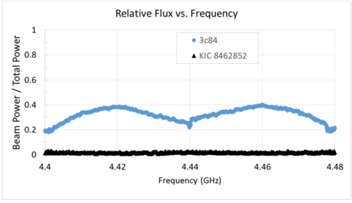 Fig 1 from Harp et al. (2015) conveys the lack of radio waves emerging from the star KIC 8462852 (black symbols),