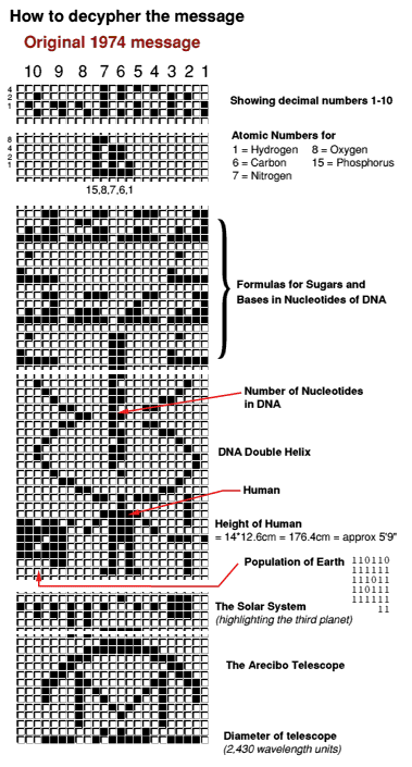 What's this? this is the original speculative message sent out in November 1974 and the response(?) found as a crop glyph in southern England.