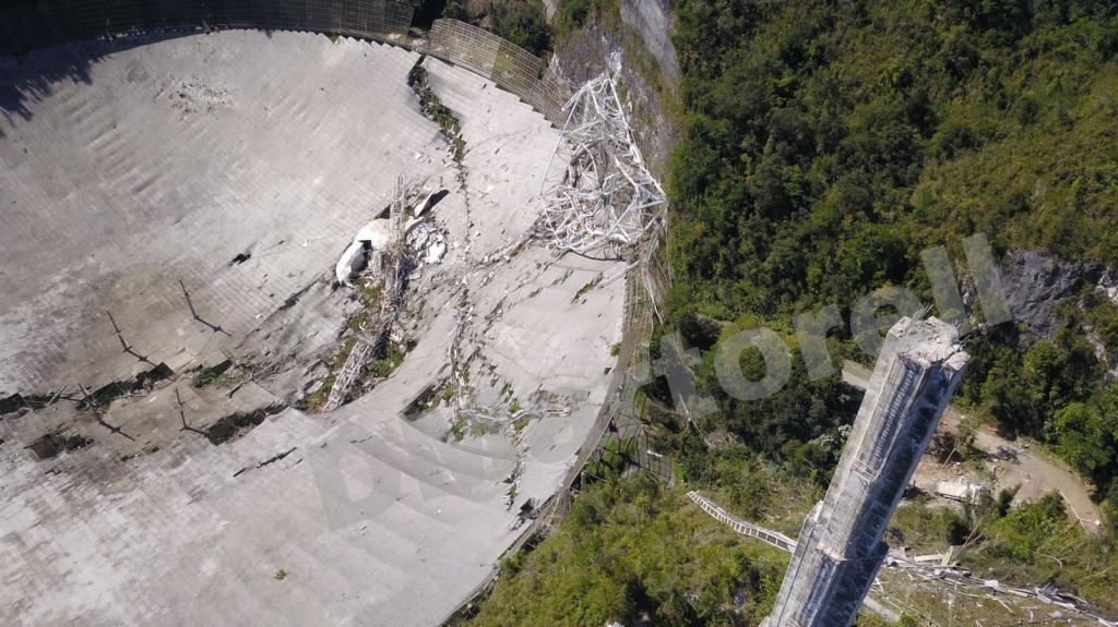 Aerial view of the damage to the Arecibo Observatory following the collapse of the telescope platform on December 1st, 2020. Photo courtesy of Deborah Martorell.