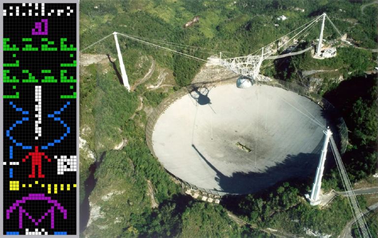 The Arecibo radio telescope in Puerto Rico and the Arecibo Message (inset). Credit: Seth Shostak/SETI Institute/AP