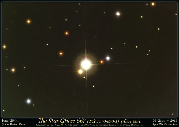 The nearby triple star system Gliese 667, taken on June 29, 2013. Credit and copyright: Efrain Morales, Jaicoa Observatory, Puerto Rico. Here is a great new observation of the triple star system Gliese 667 from astrophotographer Efrain Morales of the Jaicoa Observatory in Puerto Rico. Recently, one of the stars, 667 C was found to have perhaps seven planets orbiting it! If all seven planets are confirmed, the system would consist of three habitable-zone super-Earths, two hot planets further in, and two cooler planets further out. Scientists say that the ?f? planet is ?a prime candidate for habitability.?