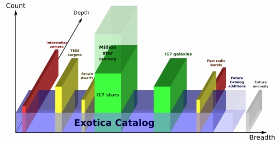 mage: This is Figure 1 from the paper. Caption: A cartoon of the three directions of target selection and the relative advantages of Breakthrough Listen’s primary programs observing stars and galaxies (green), a survey of the Breakthrough Listen Exotica Catalog (blue), and some example campaigns. Previous SETI surveys have generally aimed for depth, achieving strong limits for a small number of similar targets, or high-count, achieving modest limits for a large number of similar targets. Other exotica efforts can be high-depth (red) or high-count (gold) campaigns, but observations of the Exotica Catalog will be broad, achieving modest limits on a small number each of a wide variety of targets. Future discoveries may be added to a later version of the catalog (pale blue), or prompt new campaigns that we cannot yet plan for (grey). Credit: Lacki et al.
