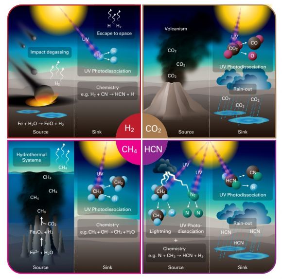 Significant gaps exist in our understanding of early Earth’s atmosphere because geologic evidence isn’t complete. This image is from a separate study and shows four sources and sinks for key molecular species in Earth’s early atmosphere. By combining the new evolutionary knowledge of rhodopsins with our models of early Earth, we can better understand what primitive life might look like on other worlds and what those atmospheres might look like. Image Credit: Pearce et al. 2022.
