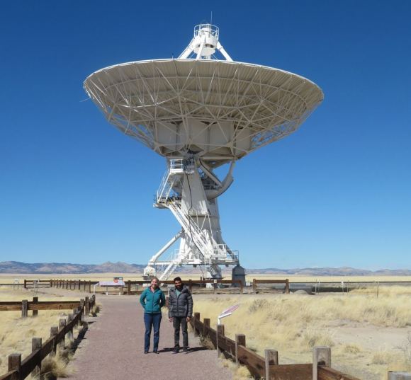 SETI Institute Post-Doctoral Researchers, Dr. Savin Varghese, and Dr. Chenoa Tremblay, in front of one of the 82-foot diameter dishes that make up the Very Large Array. Credit: SETI Institute