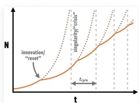 This graph from the study shows how population growth leads to singularities that must be avoided by resets or innovations. Image Credit: Bettencourt et al.