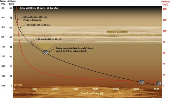 Rocket Lab’s planned high-energy Photon mission to Venus is slated to conduct the approximate 5-minute science phase of its mission at 48-60 kilometers (30-37 miles) above the surface. (Credit: NASA Ames Research Center)