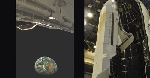 Earth as seen in the first on-orbit photo released by the X-37B (left); the space plane prepares for its seventh mission, which launched on Dec. 28, 2023. (Image credit: US Space Force)