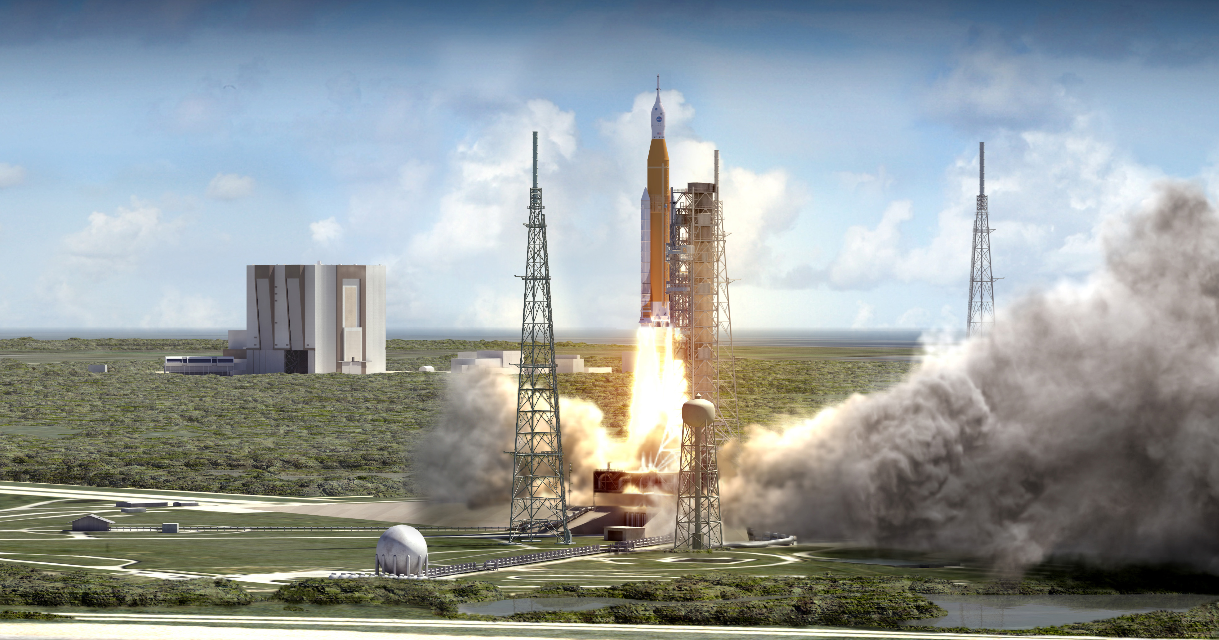 in this artist rendering showing a view of the liftoff of the Block 1 70-metric-ton (77-ton) crew vehicle configuration.