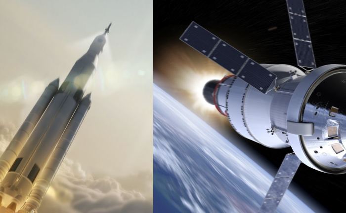Artist concept of NASA’s Space Launch System (SLS) on the left, and the Orion Multi-Purpose Crew Vehicle (right). Credit: NASA