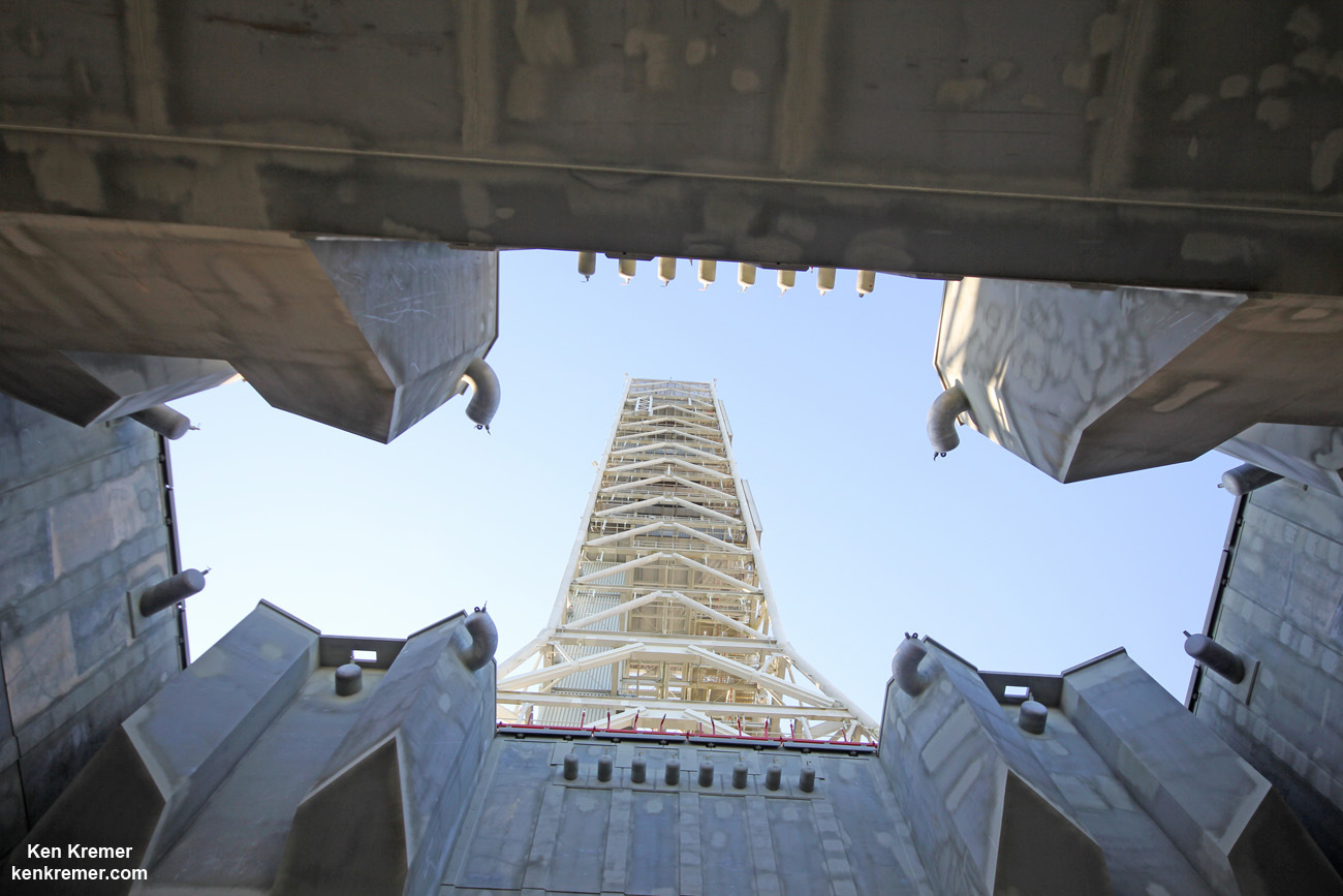 Looking up from beneath the enlarged exhaust hole of the Mobile Launcher to the 380 foot-tall tower
