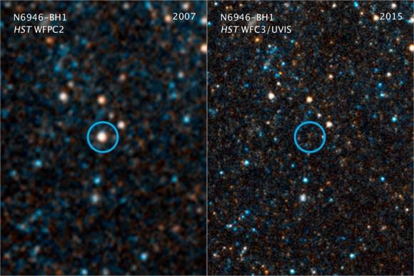 Visible-light and near-infrared photos from NASA’s Hubble Space Telescope showing the giant star N6946-BH1