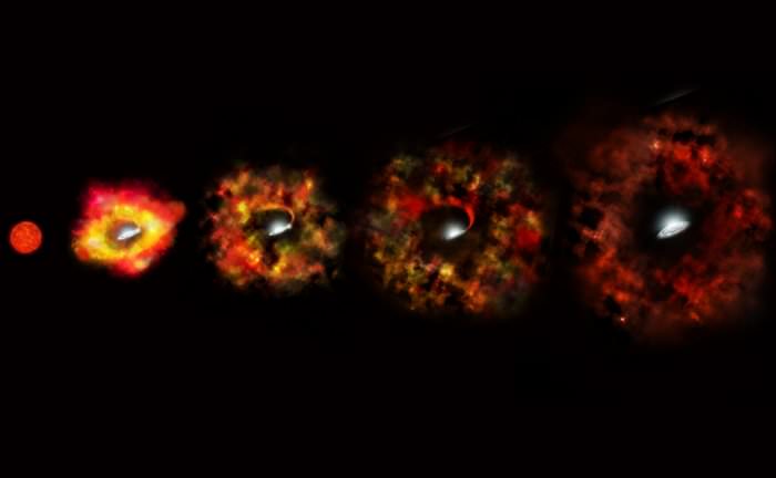This illustration shows the final stages in the life of a supermassive star that fails to explode as a supernova,