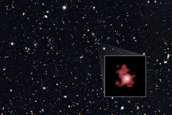 Galaxy GN-z11, shown in the inset, is seen as it was 13.4 billion years in the past, just 400 million years after the Big Bang. Credit: NASA/ESA/P. Oesch (Yale University), G. Brammer (STScI), P. van Dokkum (Yale University), and G. Illingworth (UCSC)
