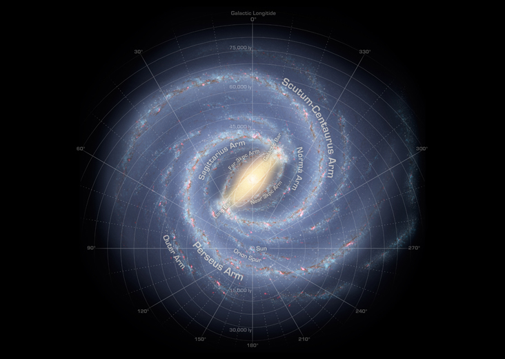 This annotated artist's conception illustrates our current understanding of the structure of the Milky Way galaxy.