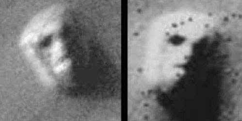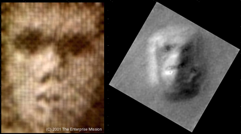 Its announcement in England caused an immediate worldwide sensation on the Internet - not the least, because it struck many observers as a deliberate effort to remind everyone of the infamous Face on Mars. For one thing, the Face crop effort seemed to be designed to replicate the light and shading of the original Viking Cydonia image (below, right).
