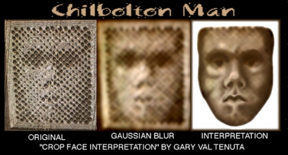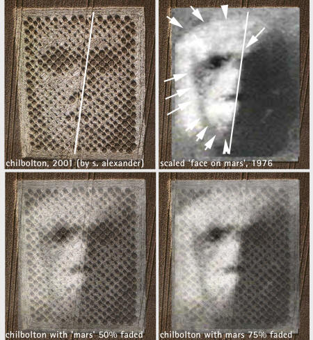 The Face turned out, under a "Gaussian blur filter" (thanks to Paul Lowrance - below, left), to bear a strong resemblance to a somewhat primitive human face - not unlike the left hand side of the human/feline hybrid of the Face on Mars ... if the Face’s erosion was removed. But, the Chilbolton glyph lacked a key feature of the Cydonia Face - the distinctive "platform" around the base. In place of this, however, it was obviously carefully placed within a frame (see above).