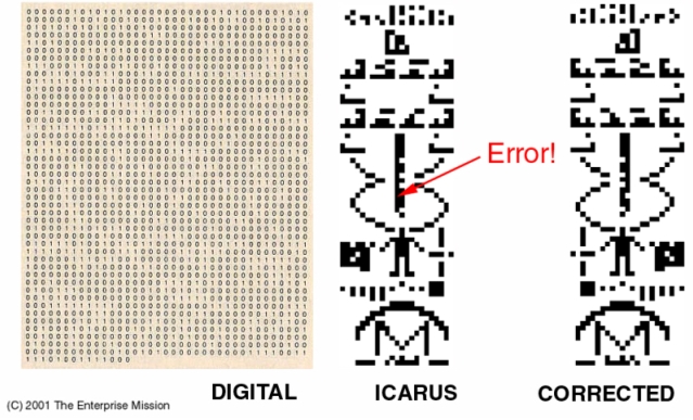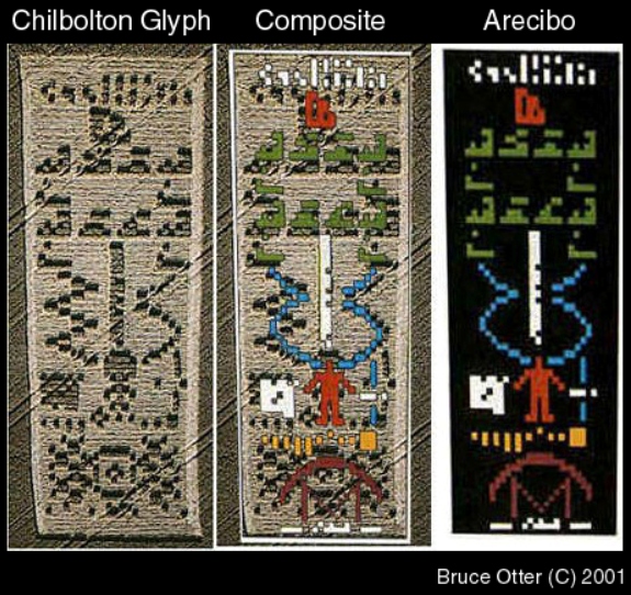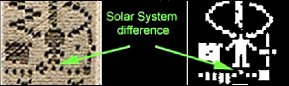 It carried the same binary “mistake” - “four billion nucleotides in the human genome” - originally transmitted in November, 1974… and another “pictogram” version of the same erroneous comparative diagram published in Icarus itself. The fascinating aspect of this diagram is that, while the binary is clearly wrong (too many nucleotides for 1974)… the black and white “pictogram” claiming to represent that binary version is even “wronger!”