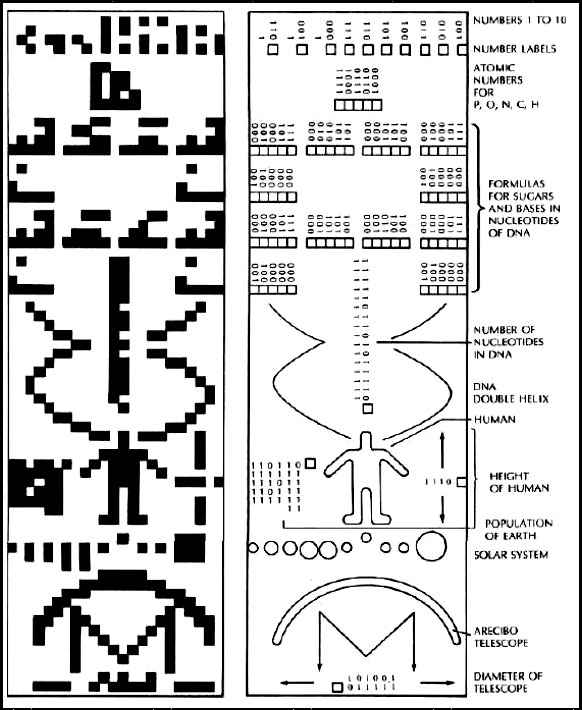 The original "SETI Message" (below, right) shows a variety of binary images (colorized here, for easier visualization) –- composed of “ones” and “zeros” –- meant to tell a story to any ET civilization intercepting it.