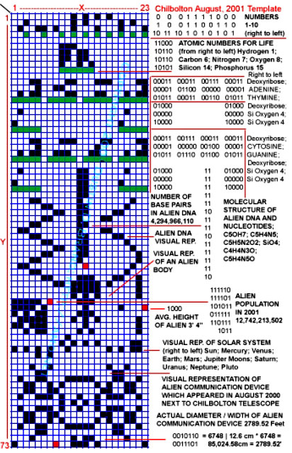 But this second glyph, at first dubbed the "Persian carpet," had a far more compelling story to tell than the mere appearance of “a “face.” Crop circle investigators in England quickly realized that this second glyph was a near dead ringer for a “SETI” (Search For Extraterrestrial Intelligence) message composed and transmitted from the Arecibo Radio Telescope in Puerto Rico in 1974 - 27 years before and thousands of miles away from this Chilbolton field (below, left).