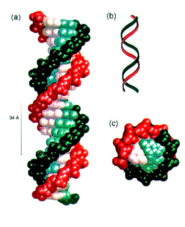 “DNA is a polymer. That is to say it has a regular, repeating backbone with side groups called ‘bases’ projecting at regular intervals. However all the bases are not the same, there are four kinds of them and the genetic information is conveyed by the precise order of the different sorts of bases along the DNA.