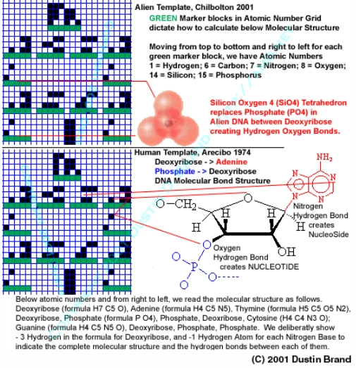 To begin with, the first line - the decimal equivalents of the binary code - were unchanged. But the atomic numbers of the elements composing the basis of Life had been altered: silicon, an element with an atomic number of 14, was added precisely in the correct sequence - between oxygen (atomic number 8) and phosphorus (atomic number 15).