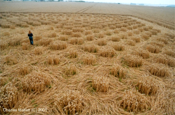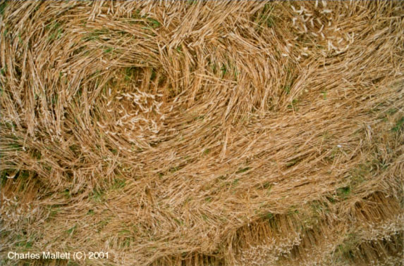 “… The 'face' and the 'message' at Chilbolton presented different clews [from the previous Milk Hill formation]. The farmer, at my request, when harvesting the field, lowered his harvester cutting boom to approx 1 inch above ground level. In my experience, this is an excellent method of finding underlay. What I found was VERY revealing indeed.