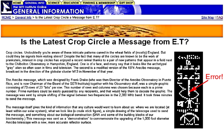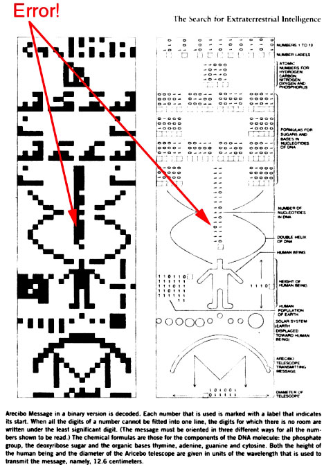 Further, when informed of this error personally by Dustin Brand (in a recent phone conversation), Shostak has done nothing to remove the erroneous “cartoon” - which he is still representing on the SETI website as the real Arecibo transmission of 27 years ago. In fact, a couple days after his conversation with Brand, Shostak authorized another article on the SETI website, featuring again the same mistaken, “alien” visual version of the 1974 Transmission.