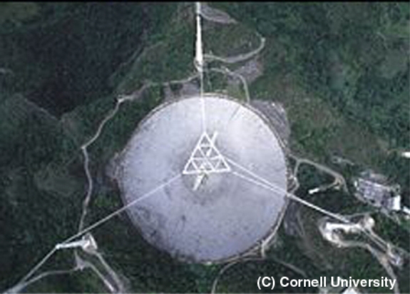 Arecibo’s “dish” is a 1000-foot diameter spherical metal reflector, lying fixed across a water-carved limestone valley (a “karst”) in northern Puerto Rico. Being immobile, it can only view the sky passing almost directly overhead (below).