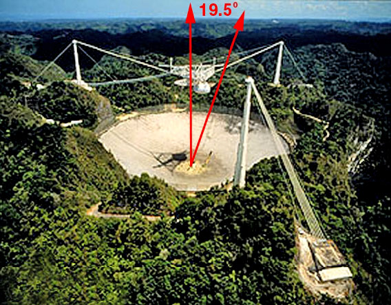 A bit of further research indicated that, beginning at 12:56 PM on November 16, 1974, for two brief moments… M-13 stood precisely 19.5 degrees away from the zenith of the Arecibo Telescope (below) ….