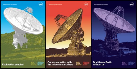 Graphics posters showing the three 70-m antennas that are part of the DSN. Credit – NASA / JPL-Caltech