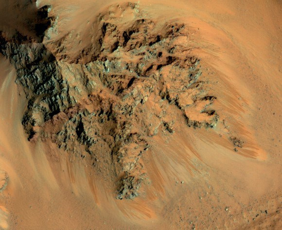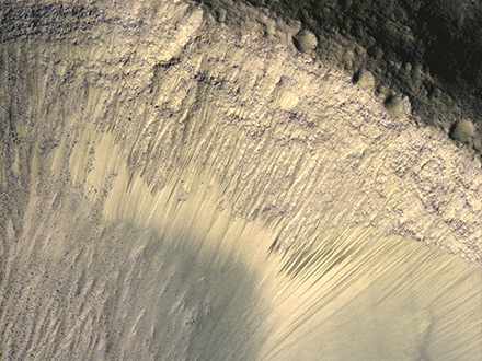 Seasonal flows spotted by HiRISE on northwestern slopes in Hale Crater. (NASA/JPL/University of Arizona) As the midsummer Sun beats down on the southern mountains of Mars, bringing daytime temperatures soaring up to a balmy 25�C (77�F), some of their slopes become darkened with long, rusty stains that may be the result of water seeping out from just below the surface.