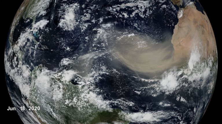 A dust storm carrying Saharan dust across the Atlantic Ocean in 2018. Credit: NASA / Scientific Visualization Studio