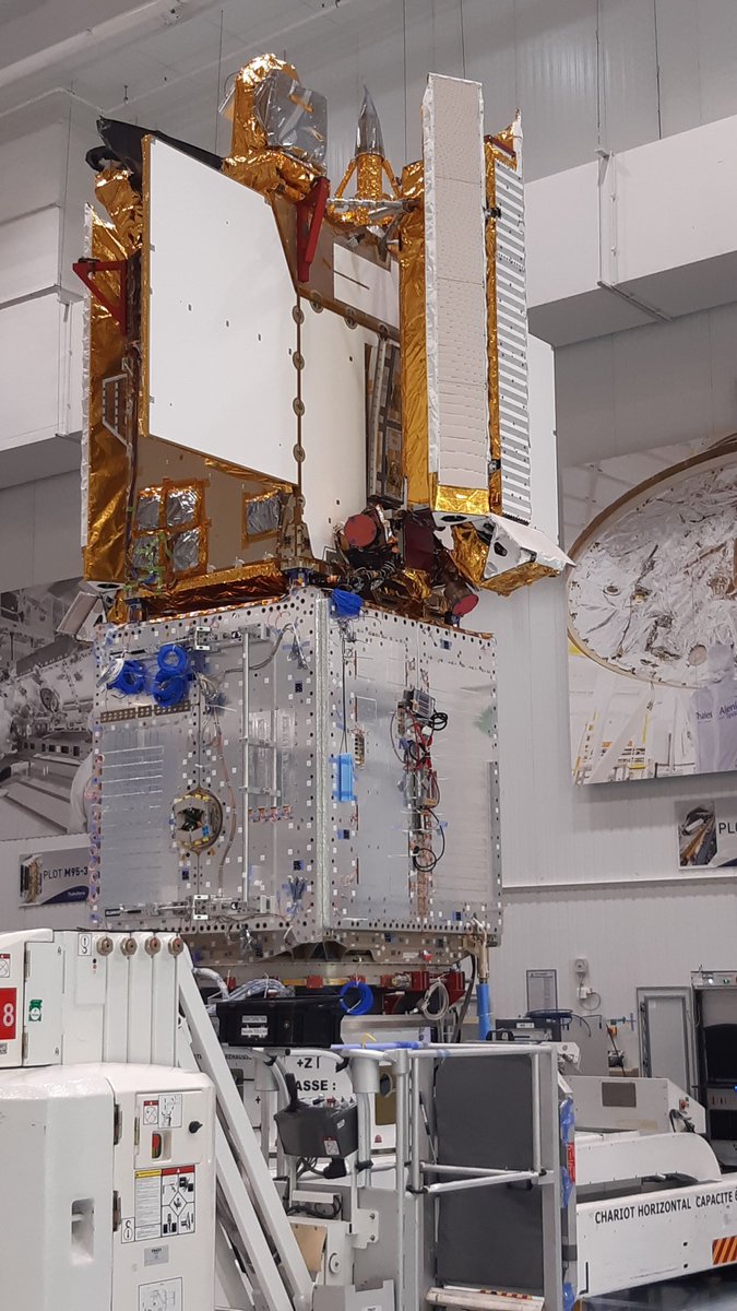 The SWOT satellite is mated to a platform in the Thales Alenia Space Cannes Center. Credit: Emmanuel Briot (Wikimedia Commons).